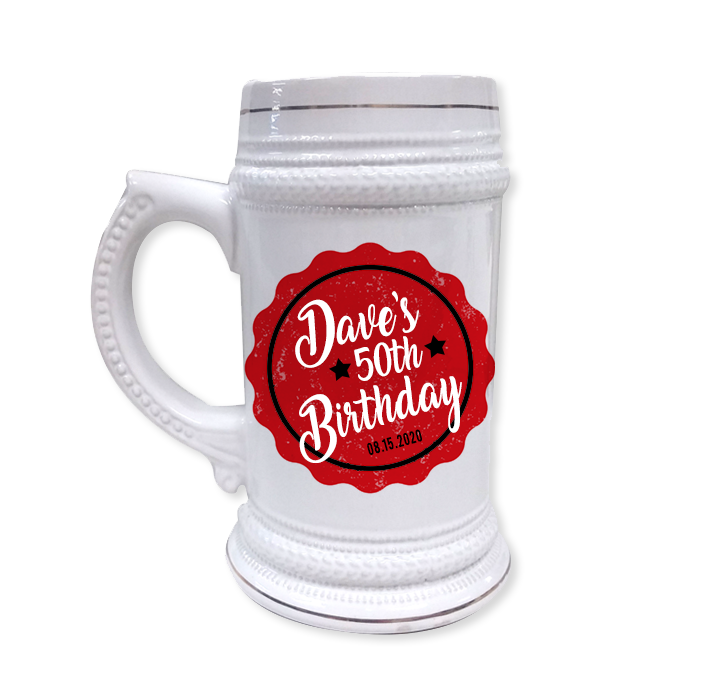 Score an amazing deal! Get this Authentic-looking German Stein with white ceramic and gold trim - printed with the "Beer Lover's Birthday Design" and added with unique text [containing name, birthday, and date] that can hold up to 22 oz of beer - your favorite beverage!