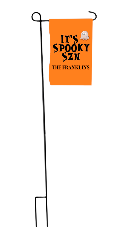 Sturdy, black wrought iron flag pole holds a 12” x 18” flag. Flag pole is 8mm in diameter, 49” tall (above ground) with a 9” ground stake that holds it in place.