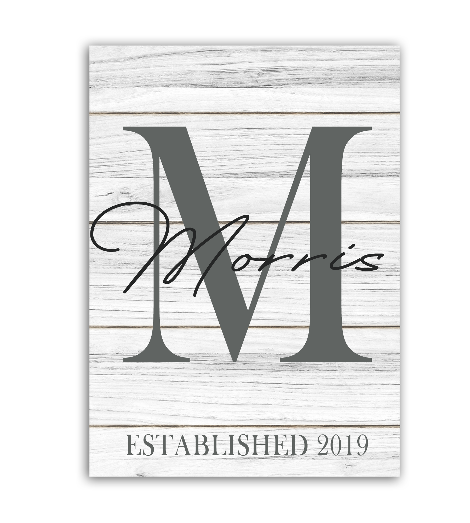 Beautiful natural wood board with faux planked white washed background. Personalize with text, just include name and year. Features a keyhole for easy.