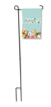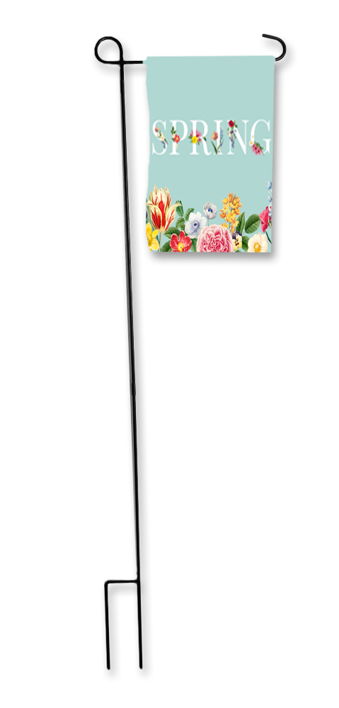 Sturdy, black wrought iron flag pole holds a 12” x 18” flag. Flag pole is 8mm in diameter, 49” tall (above ground) with a 9” ground stake that holds it in place.