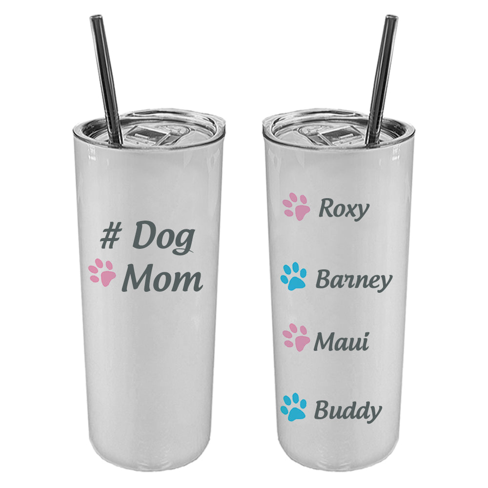 This #DogMom tumbler boasts a double-walled stainless steel construction that is non-leaching and non-toxic. Its vacuum seal ensures that liquids and carbonation remain fresh, and its easy-to-grasp cylinder shape and two-sided design make it stand out. The front of the tumbler reads "#DogMom" and the back can be customized with the names of your furry friends.