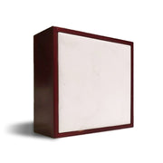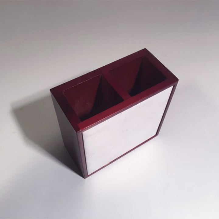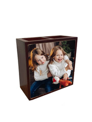Crafted with mahogany wood, this pencil holder features two compartments at the top. The center is adorned with a personalized tile, with the ability to customize with an image or text of your choice.